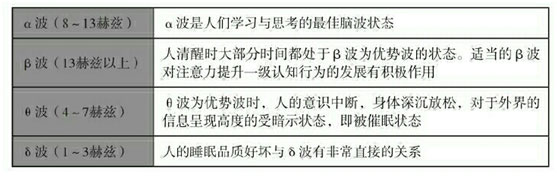 脑电波是人的大脑在活动时,皮质细胞群间产生电位差,在皮质细胞外产生的生物电流。脑电波是大脑神经细胞的电生理活动在大脑皮层表面的反映。 脑电波可以分为δ、θ、α、β四种波形,下面是四种波形的特点: α波(阿尔法波)是一种奇妙的脑波,大脑处于完全放松的状态,或是在心神专注的时候,α波就会出现。它与安静和觉醒状态相关,以“放松”和“沉思”为特征。脑电波处于α波时,人的身心能量消耗最少,大脑可以获得的能量较多,大脑运作就会更加快速、敏锐。人在这种脑波状态下更容易通往潜意识,迸发灵感,激活创作之源,同时也能达到最佳记忆和最好发挥。“α音乐”和“心想好事”都可以促使大脑产生α波。 β波(贝塔波)是一种有意识的脑波,提示皮层处于兴奋状态,所以它的节律最快(14~30赫兹)。当人在保持清醒状态,比如思考、分析、说话和积极行动时,会产生β波。想想,你正在交谈、作报告或者解一道逻辑题时,大脑正在以13~25次/秒的速度“传送”和“接受”信息,这就是β波的作用。在β波状态,人的头脑警觉、注意力集中,但可能出现烦恼、气愤、恐惧、恼火、紧张等负面或焦虑不安。而且随着β波的增加,人的身体会不断紧张,人的能量消耗加剧,体内免疫系统能力被削减,此时人就容易疲倦,若不充分休息,容易产生压力。 当你开始感觉到睡意蒙眬,或者处在半睡半醒时,你的脑波就会以4~7次/秒的速度运动,即θ波(西塔波)在θ波情况下,人开始从睡意蒙眬逐渐向全睡过渡,人的意识中断,身体放松,但是可以被外界的信息所暗示,即通常说的催眠状态。θ波能帮助人触发深沉记忆、强化长期记忆。 当你完全处于深度睡眠时,我的运动节律就很慢(1~3次/秒),这时就会出现δ波(德尔塔波)。这时,你的呼吸深入,心跳放慢,血压和体温下降。 一天中脑电波的真实状态是:早晨,当你还在深睡时(δ波的世界),突然被闹钟叫醒。时间来不及了,马上行动(β波到来),紧张、焦虑和匆忙的一天开始了(β波主导)!中午时间小休片刻,听歌、散步或心想好事来放松半个小时(来到α波),重新充电,整装待发地攻克下午的工作(β波主导),下午茶可以再次激发奇妙的α波。晚上休息,大脑自动调到θ波到δ波。 每种脑电波都有相对的大脑状态,只有这样大脑才能更好地完成工作。如果大脑在某种状态下,出现了与之不相应的脑波,人的行动就会出现问题。例如,如果在想睡眠时,大脑不出现δ波和θ波,人就会出现失眠症;在学习的时候,却不出现α波,而出现θ波,那么学习就无法进行。有人生动地将四个脑波比作汽车的四个挡位:δ是一挡,θ是二挡,α是三挡,β是四挡,没有哪一个挡位适合所有的行驶状态(如表1所示)。